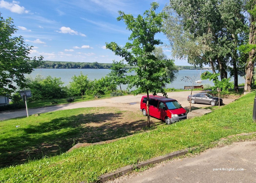 Place de parking calme entre le Danube et le parc de la ville. Juste en dessous de la rivière se trouve une plage de pierre. Il y a un distributeur d'eau potable dans la petite maison.