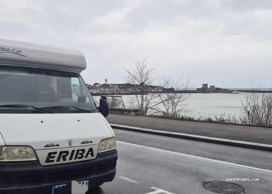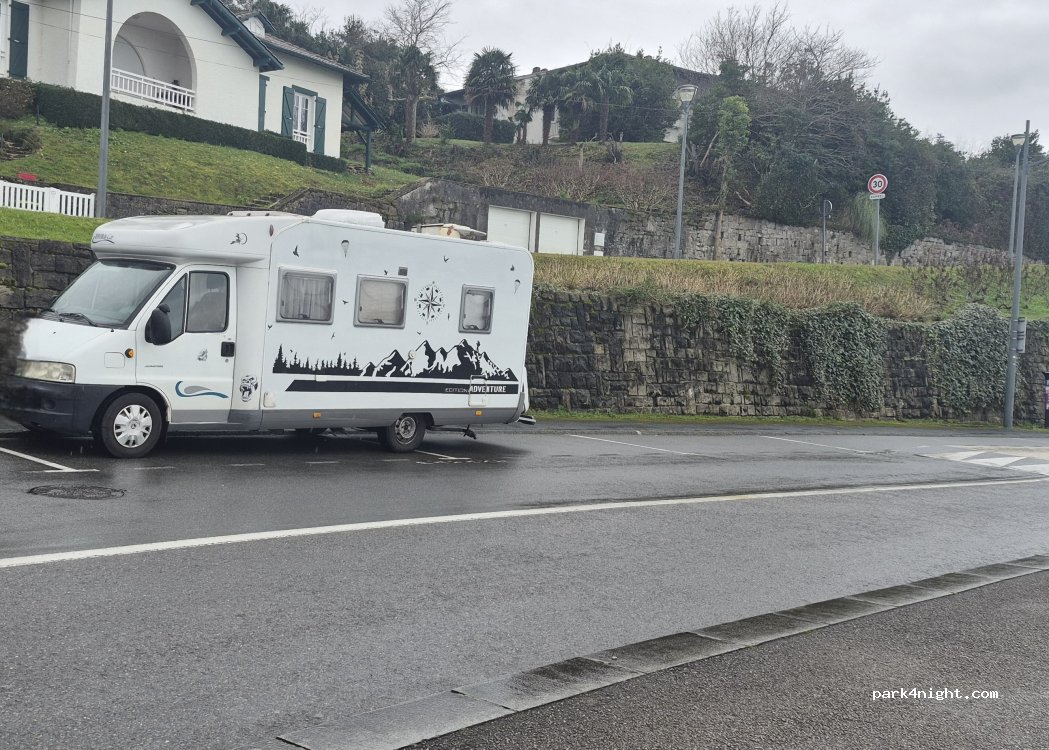 Une très belle vue. Gratuit hors saison. Des places plutôt pour fourgon en bord de plage et CC de l autre côté de la route on peut empiéter un peu sur le trottoir au même niveau que la place de parking. Plusieurs places a plats. On est en ville sur un axe passant donc il y a du bruit (normal), mention spéciale cependant a nos amis basques qui prennent un malin plaisir a klaxonner cependant ....