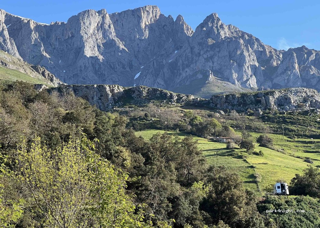 Kleine P bij een uitzichtspunt met een fantastisch uitzicht op het dal aan de ene kant en de Picos aan de andere kant. Grind/gras, min of meer horizontaal, geen voorzieningen (behalve een oud bankje), wel redelijk internet. Maximaal 1-2 campers, maximaal 7 meter. Vanuit Brez mooi wandeling. Ga er op tijd heen, want de P daar is klein (of te voet).