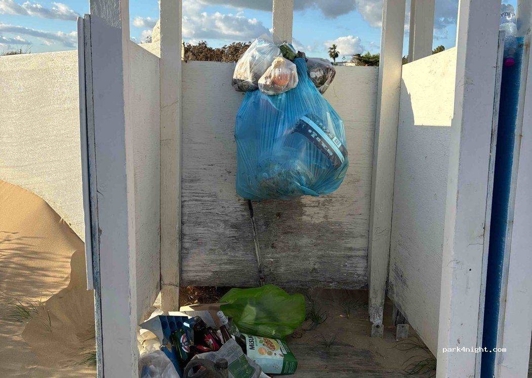 Parking gratuito con docce fredde e bidoni per immondizia,stabilimento balneare adiacente. Consiglio di arrivare la sera tardi o la mattina presto perché è un parcheggio promiscuo auto e camper.