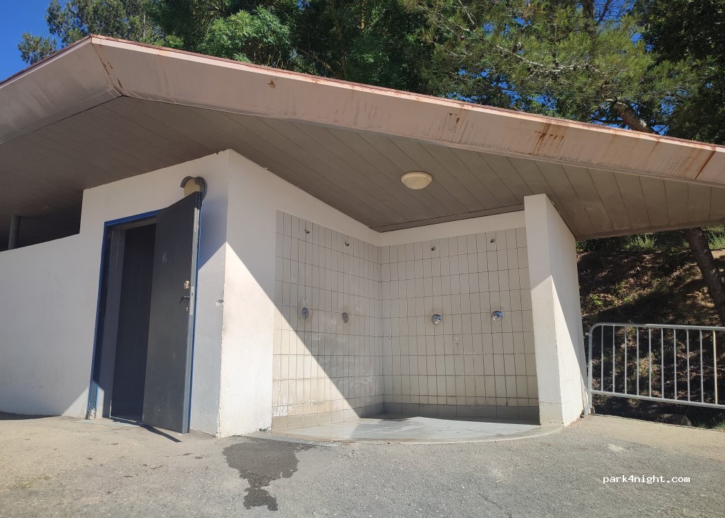 Nice and fairly spacious parking, with only about 1/4 full in June. Partially shaded. Around 800 meters away, there are restrooms and open showers — not spotless, but okay. The only issue was late-night noise (around 2 a.m.) from people returning from the lake with loud music and some brief shouting. As of June 2025, swimming in the lake is banned due to low water levels and algae pollution.