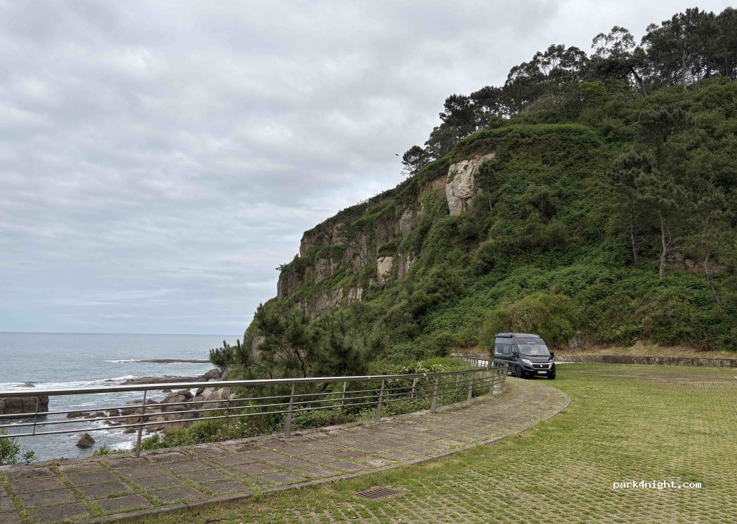 Aparcamiento maravilloso frente al mar justo encima de la playa, difícil acceso regulado por semáforo y muy poquitas plazas, hay un restaurante. Está prohibido pernoctar, como en todo el Ayuntamiento de Gijón: estábamos despiertos cuando llego la policía, y nos pudimos ir a tiempo, pero estaban empezando a multar al resto de furgonetas que estaban ya dormidos.