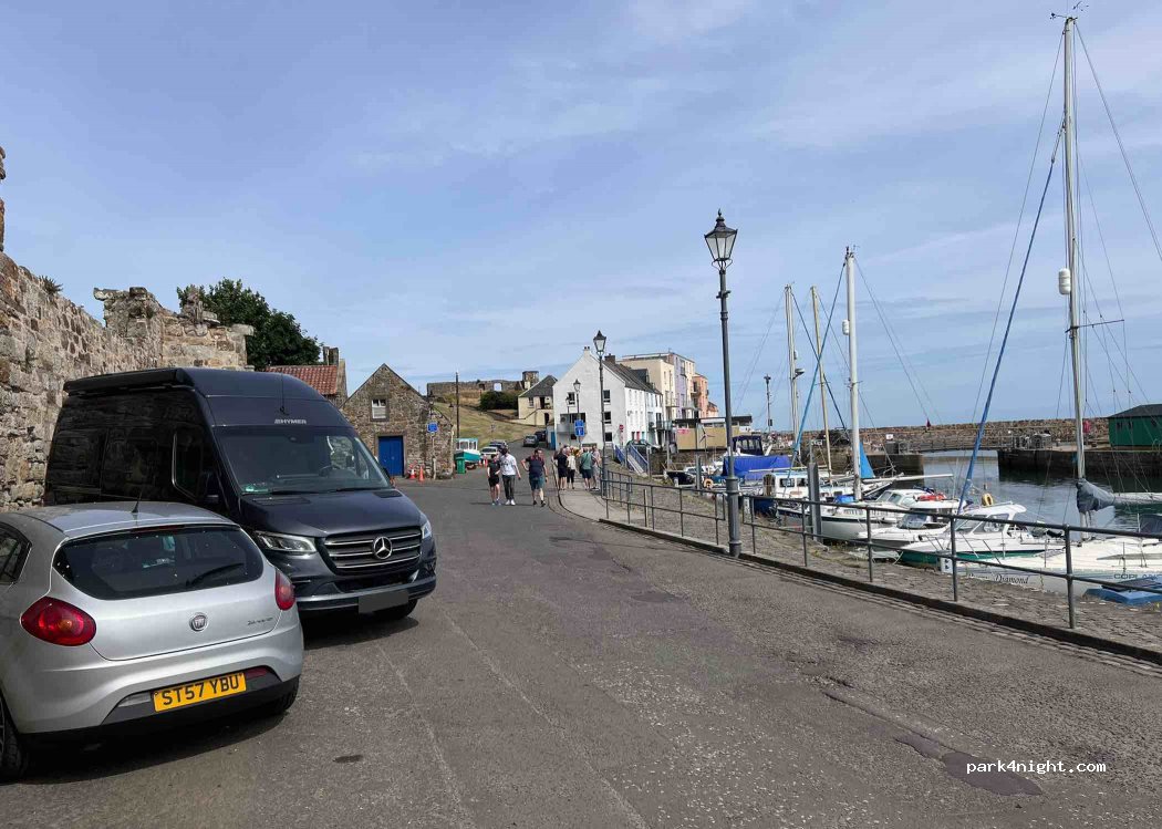 Ein ruhiger Platz, direkt am kleinen Hafen & dem Meer. Fahrzeuge über ca.6m können nur parallel zur Stadtmauer parken, was bei uns keine Probleme bereitete. Nach 2min Fußweg erreicht man einen schönen Strand. An der Tordurchfahrt gibt es eine öffentliche Toilette, die tagsüber geöffnet hat. Das Zentrum von St.Andrews ist fußläufig in ca.10min erreichbar