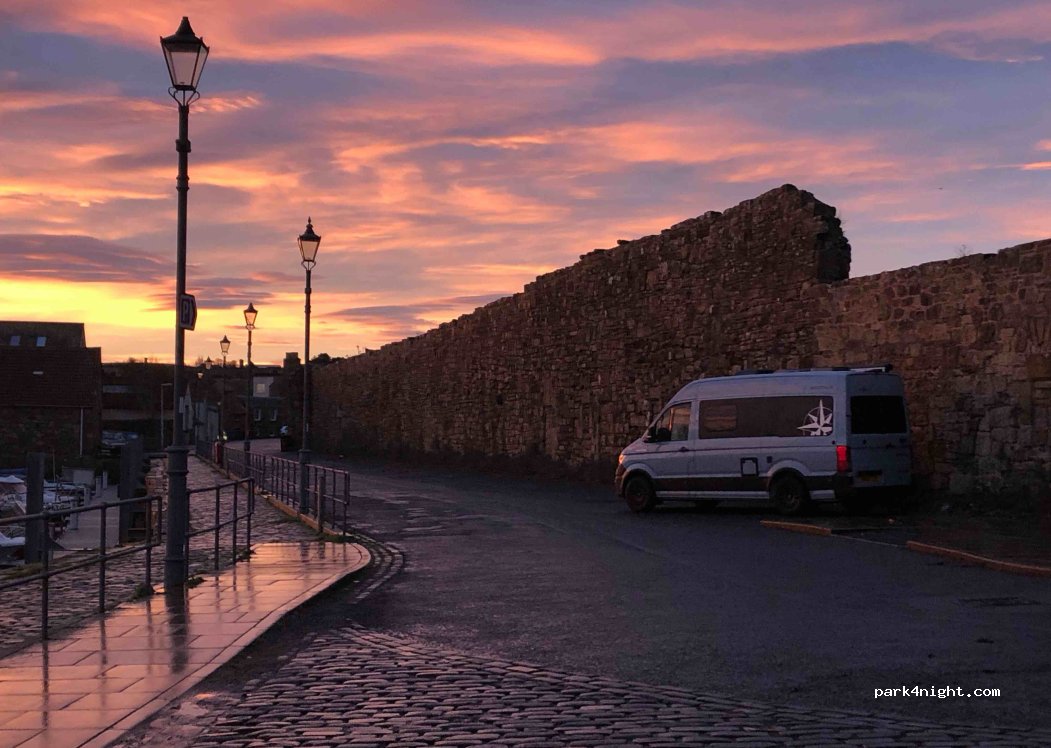 lovely spot to park up for the night! I loved listening to the sound of the harbour over night, might be a bit nosey for some. access to East Sands, great for a walk if you're traveling with dogs. *If you're traveling in a motorhome with an overcab,DO NOT take the road down from the town centre through the arches at St Leonards. The wall arch at the bottom is 8ft and you WILL NOT get through it!*