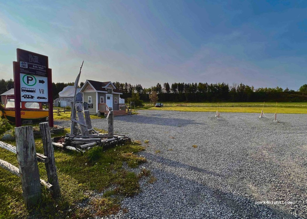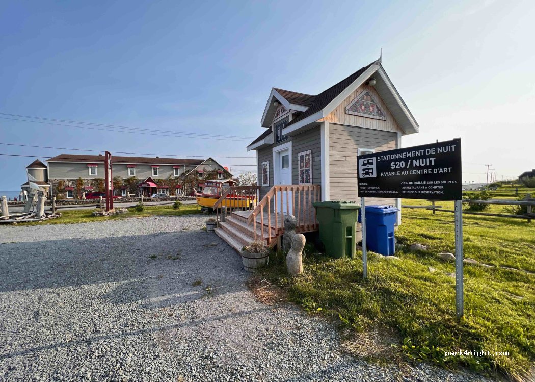$ 20 por noche, incluye acceso a baño, wifi, agua potable y un 10% de descuento en su comida en el comedor esa misma noche, sujeto a disponibilidad. Zona de aparcamiento de autocaravanas, a lo largo de la ruta 132, frente al Centre d'Art Marcel Gagnon.