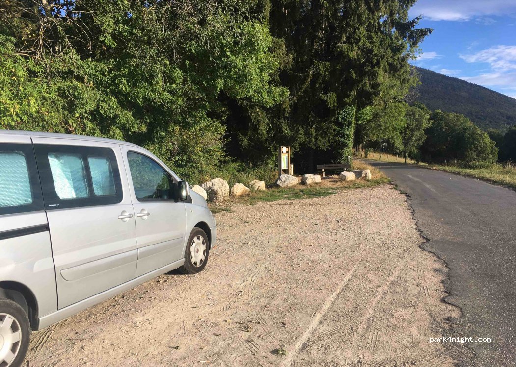 Small car park at the start of the Allondon source trail. View of the Salève, but at the edge of the road.