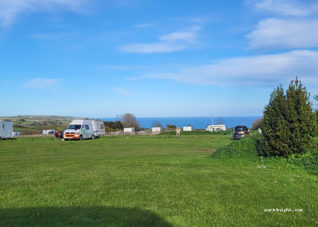 Lovely peaceful, laid-back camping site. Currently costs £17 for a camper van (incl. inhabitants). Toilets and showers (£1) simple but clean. Great view of the sea. One field for clothed campers, one for naturists. 15 minute walk to the beach.