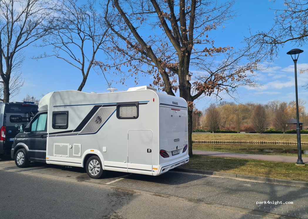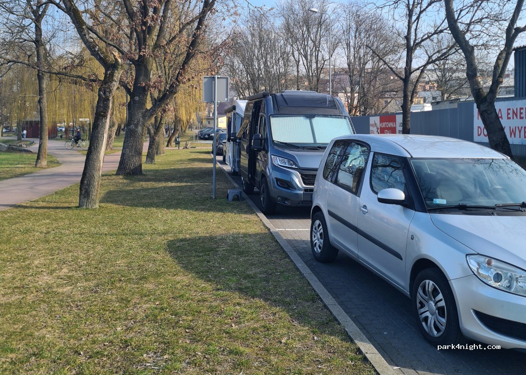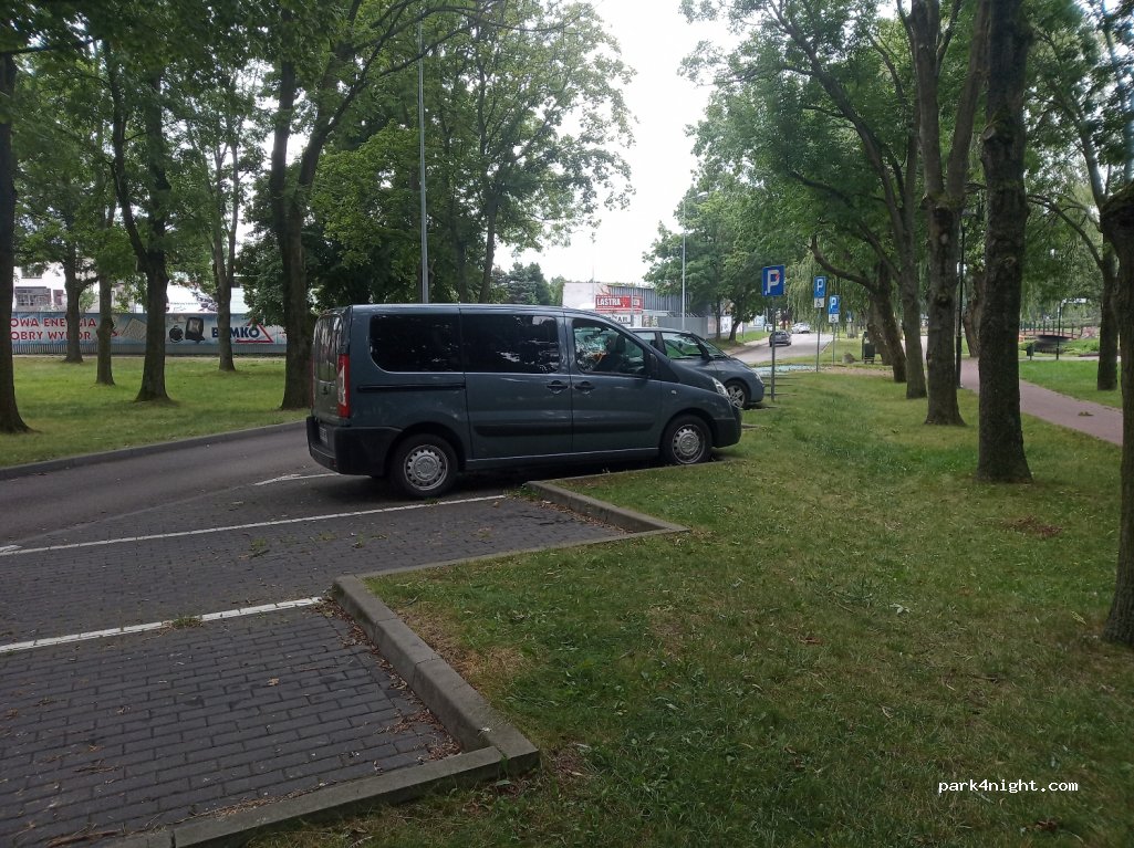 Parking przy parku. Można zaparkować kamperem. Wieczorem spokojnie. Rano jeździło trochę samochodów.