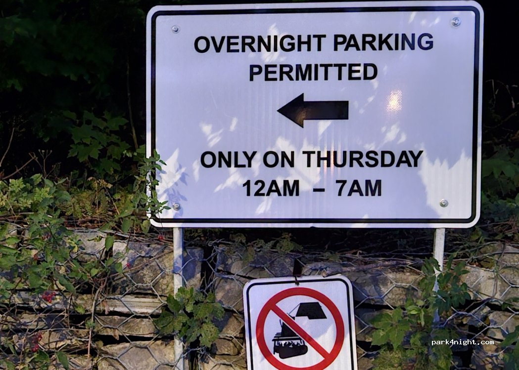 There are 2 sets of parking spaces for overnight parking in this parking lot. On Thursdays only, you use the south part of the parking lot. Otherwise, on every other nights, you use the upper part to the north of the parking lot.