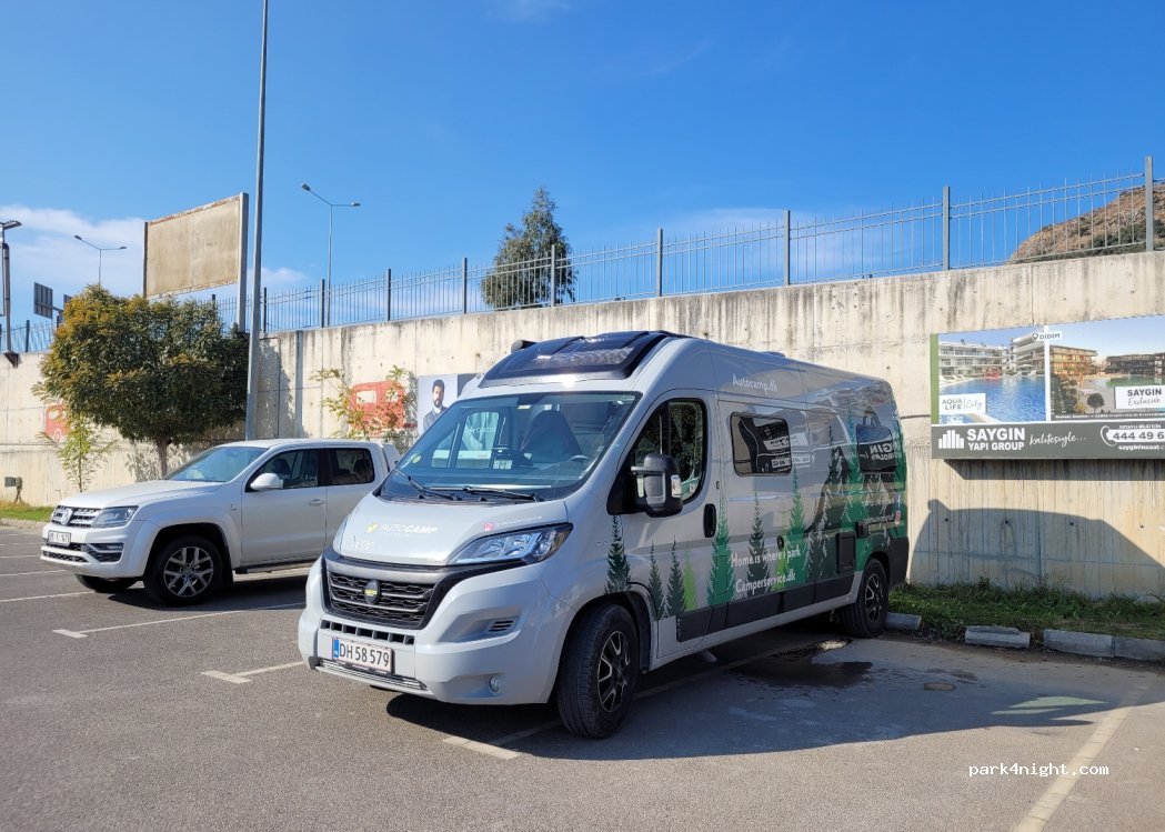 Es ist tatsächlich ein Stellplatz mit Wasser und Strom allerdings nur für eine Nacht. Denn die einheimischen Camper haben es in der Vergangenheit übertrieben und sich wie überall in der Türkei niedergelassen und den Platz blockiert. Gleich nach der einfährt links rein und am Ende sieht man schon an der Mauer die Camper Zeichen. Einmal zur security und sich registrieren und das wars. Kostenfrei