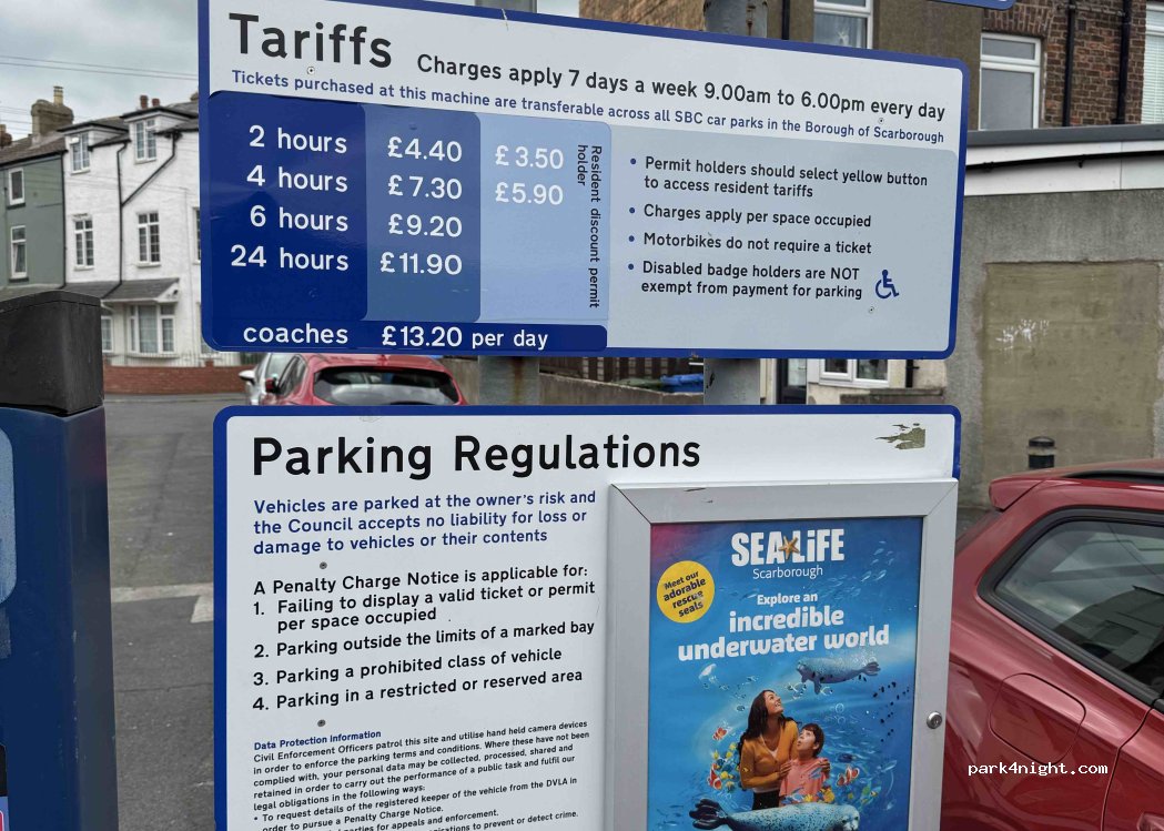 Parking de Scarborough... Autocars et les poids lourds restent la nuit. Aucune restriction de signalée.