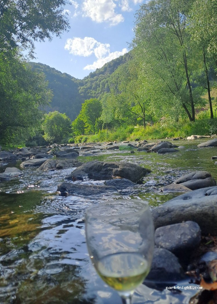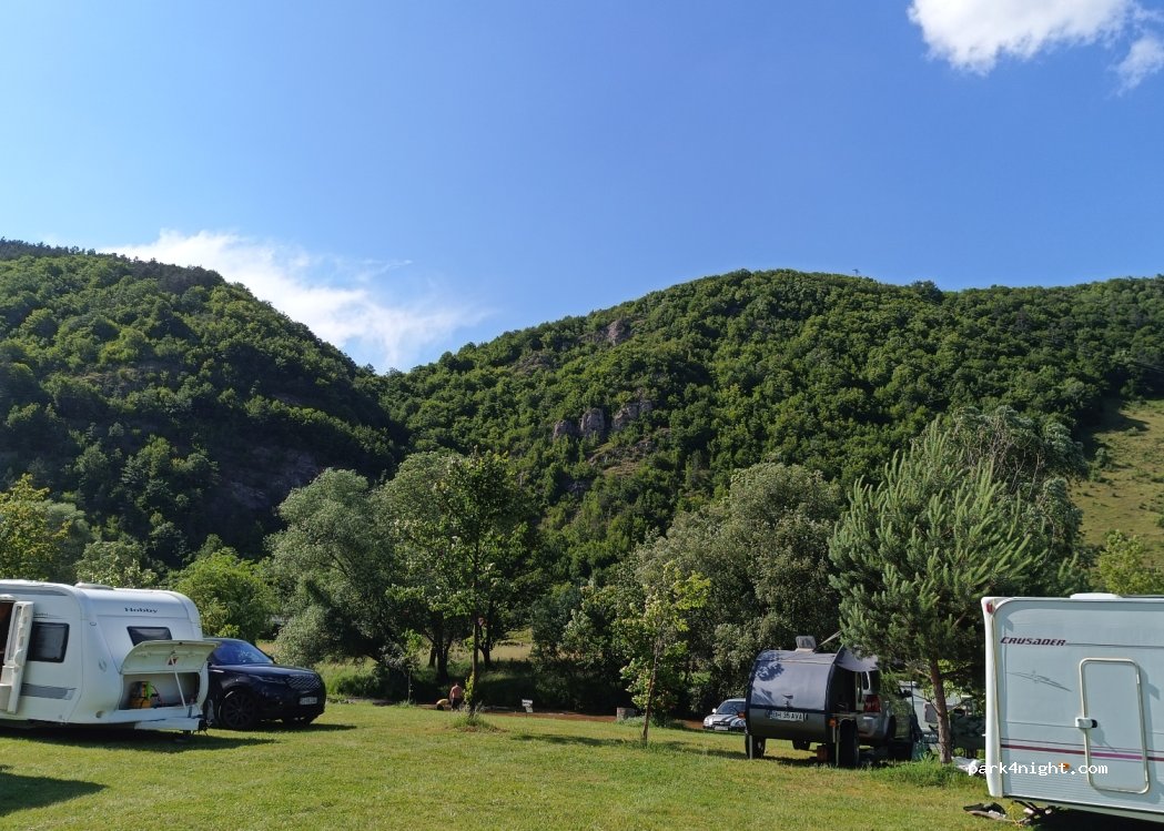 Camping agréable et calme dans la vallée au bord de la rivière où vous pourrez vous rafraîchir et où il est possible de pêcher. Belle aire de jeux pour les enfants. WC, douches (chauffées par le soleil) et cuisine présents. Aussi plusieurs endroits pour le feu et le grill. Plusieurs postes avec électricité et eau. Les eaux grises et noires peuvent être évacuées à côté du bâtiment avec toilettes.