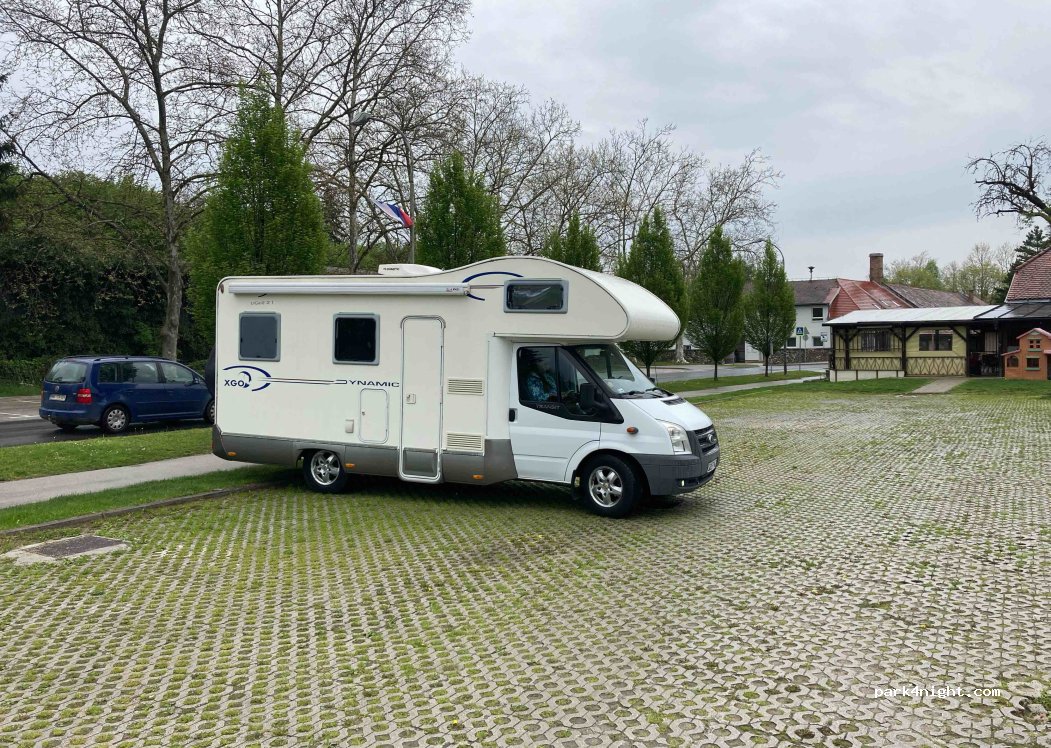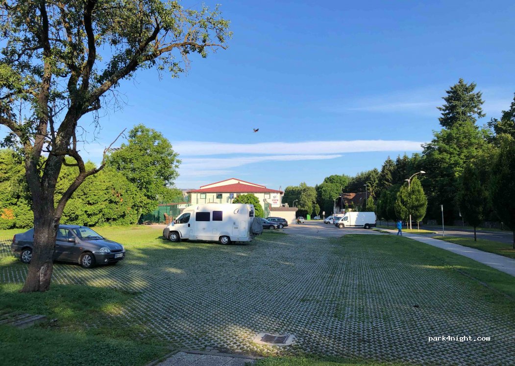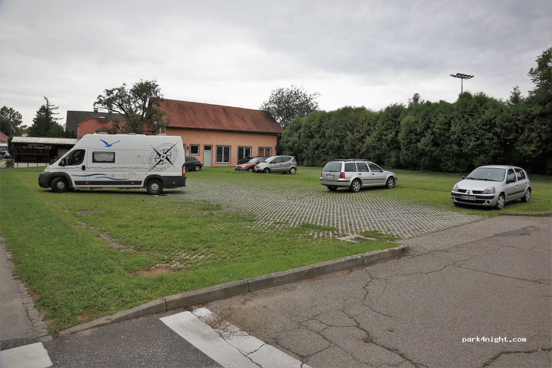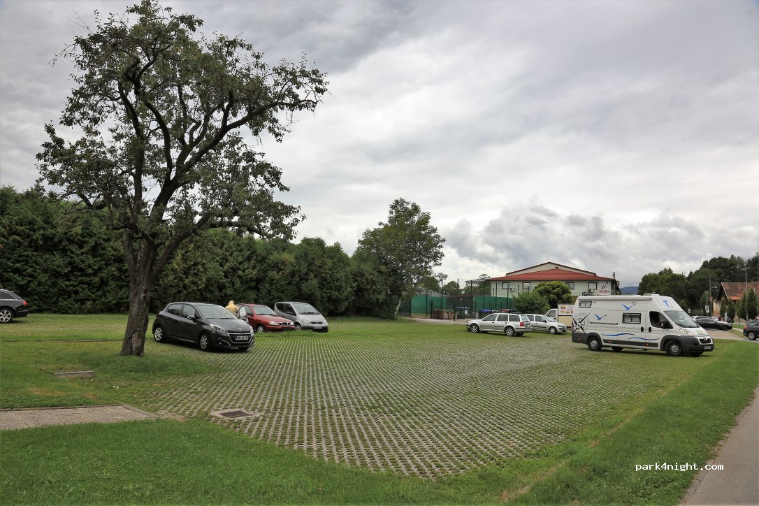 Veľmi dobré miesto na prespanie pred tenisovými kurtami. Hlučné do 23:00 o od 5.00 hod. Len 2 km od diaľnice, ľahko dostupné, v dosahu tankovanie paliva o 20 centov lacnejšie ako na dialnici, supermarket vhodný na doplnenie zásob. Vhodné ako prestávka na ceste. Free parking, bez služieb. Hneď vedľa je bar.