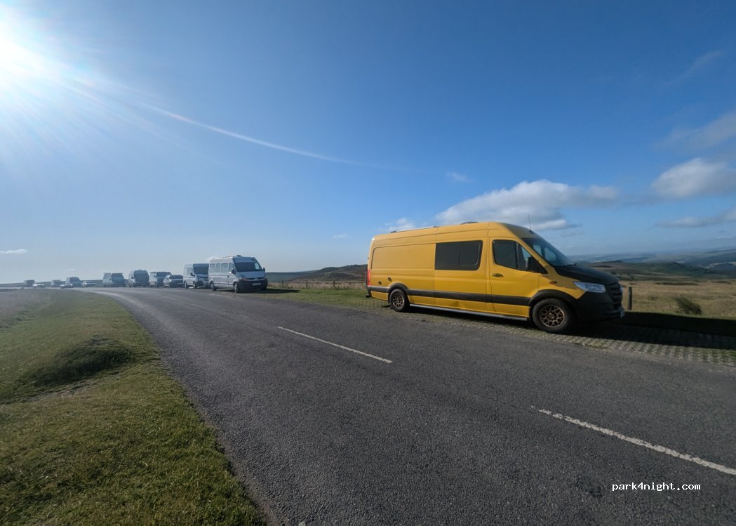 This is my go-to overnight spot in the peaks. Great views to wake up to and very quiet road after around 7pm. Stopped here multiple times and not had any problems, however please keep in mind that wild camping is not strictly legal in the Peaks so there is a chance you could get moved on (as with everywhere else in the Peaks) as this is an exposed spot. Room for at least 10 vans, but can get busy on a nice weekend. Very highly recommend!