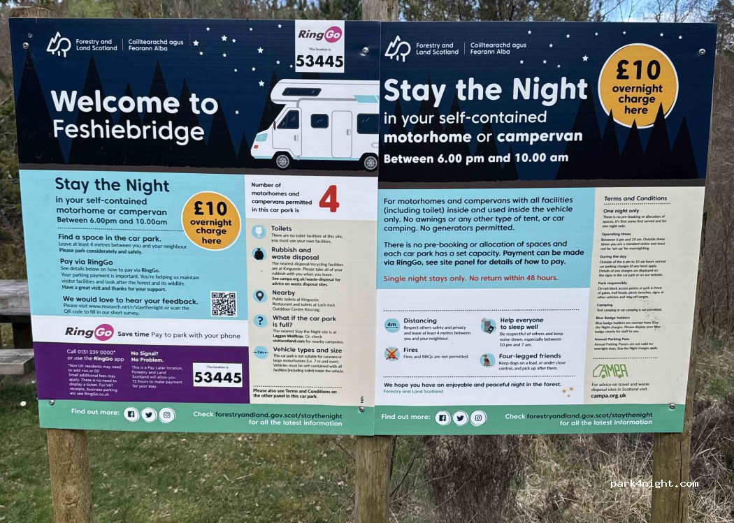 Forestry Commission car park at Feshiebridge. Part of the £10 overnight run by Scottish Forestry. Must be self contained and no services. Would not suit anything over 7m. Need to book online before or whilst there.