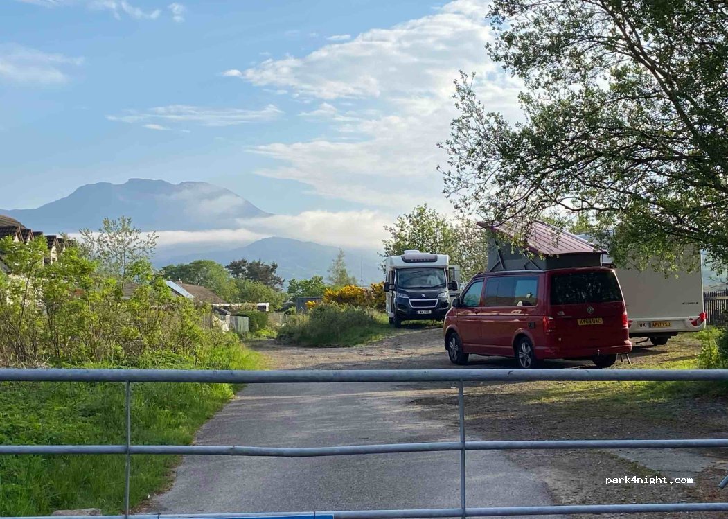 Great place, free to park overnight, £5 to use toilets. Quiet until 7ish. Owners prefer smaller vans, very friendly and helpful. We had a meal a few drinks and watched football and they offered us breakfast too, which was £15 and average to be honest but started the day right. They have a few camping spots and pods too. Perfect on way to or from Skye and only a few mins from main NC500 route.