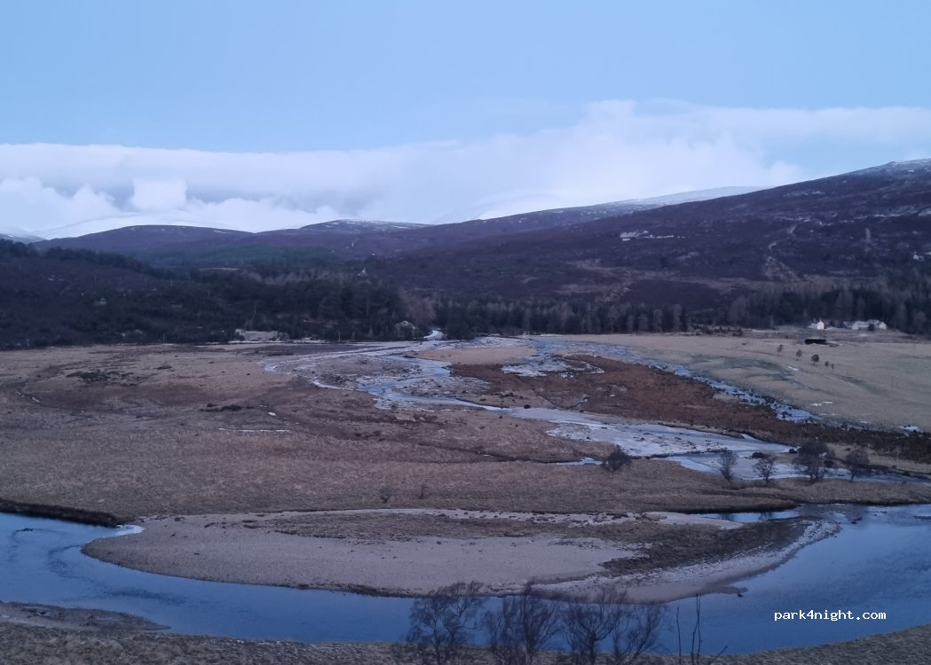 Spectacular view of the valley, we spotted a large herd of deer crossing the river below. There is a moderately steep path beside the benches down to the stoney river bank. It’s the first road slipping off the main road from Braemar. A way to tell it apart from the further slip off is that it has a stone wall. (Can easily fit two camper vans)