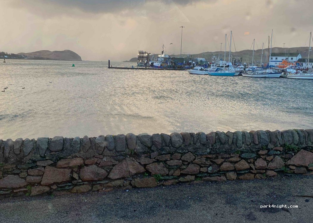 Roadside parking in Campbeltown, near a small marina and ferry port. It is on the main road, but it is very quiet throughout the night. There are no parking restrictions anywhere in the front so there is plenty of space.