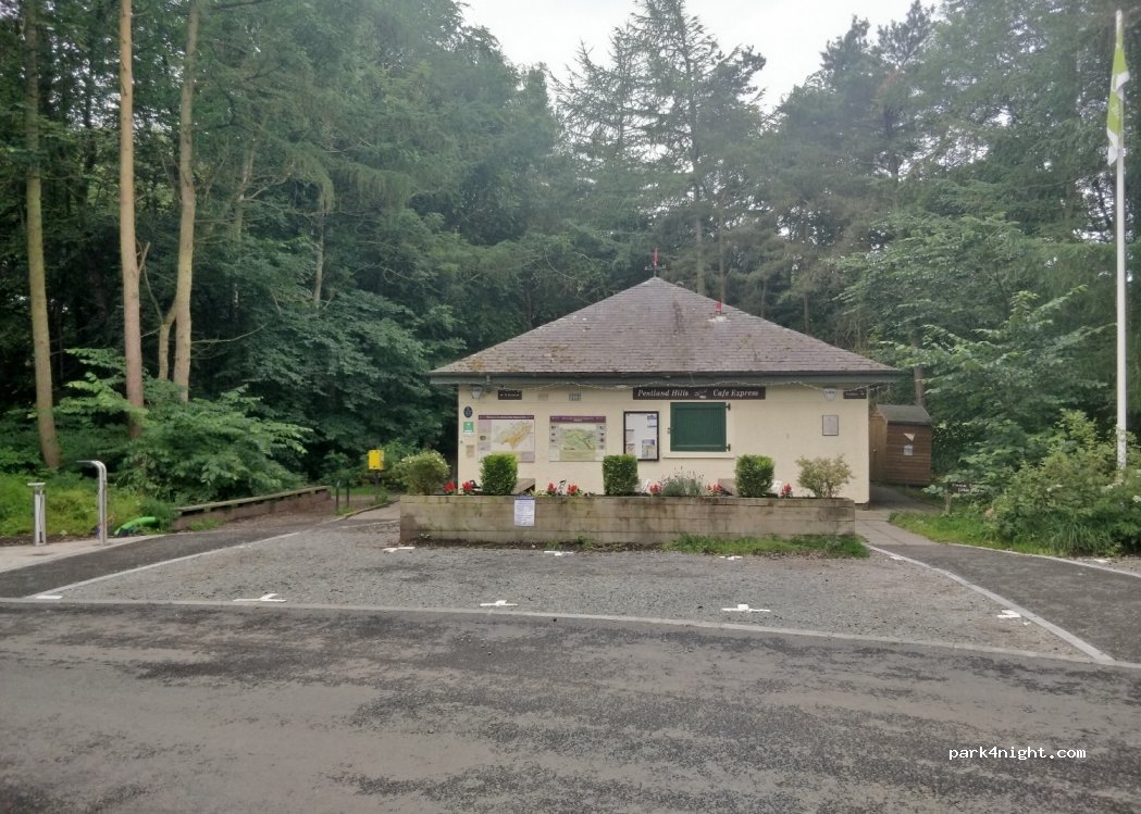 Parkplatz für Wandergebiet. Toiletten waren alt, aber funktionierten. Busverkehr direkt nach edinburgh für ca 3,75 £ hin und zurück direkt vorn an der Straße. wunderschöne Wanderungen möglich. Reger Betrieb und viele andere Camper vor Ort.