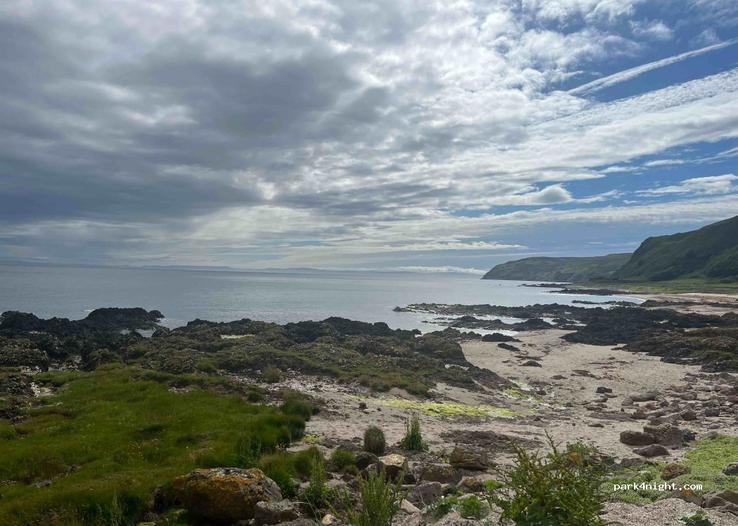 Parking place virtually on the beach with enough room for one 8m motorhome. Picnic table adjacent. Beautiful views. Sign forbidding overnight camping but no one around for miles.