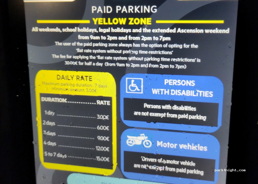 Parking payant mais aucune restriction, pas de hauteur limitée ( pas de barres ou de portique, pas de barrière) votre véhicule doit faire moins de 6,5 m , sinon il faudra prendre 2 places. Assez calme pour passer la nuit. Tarif unique pour tout le monde, 3€ /24h , jour et nuit .