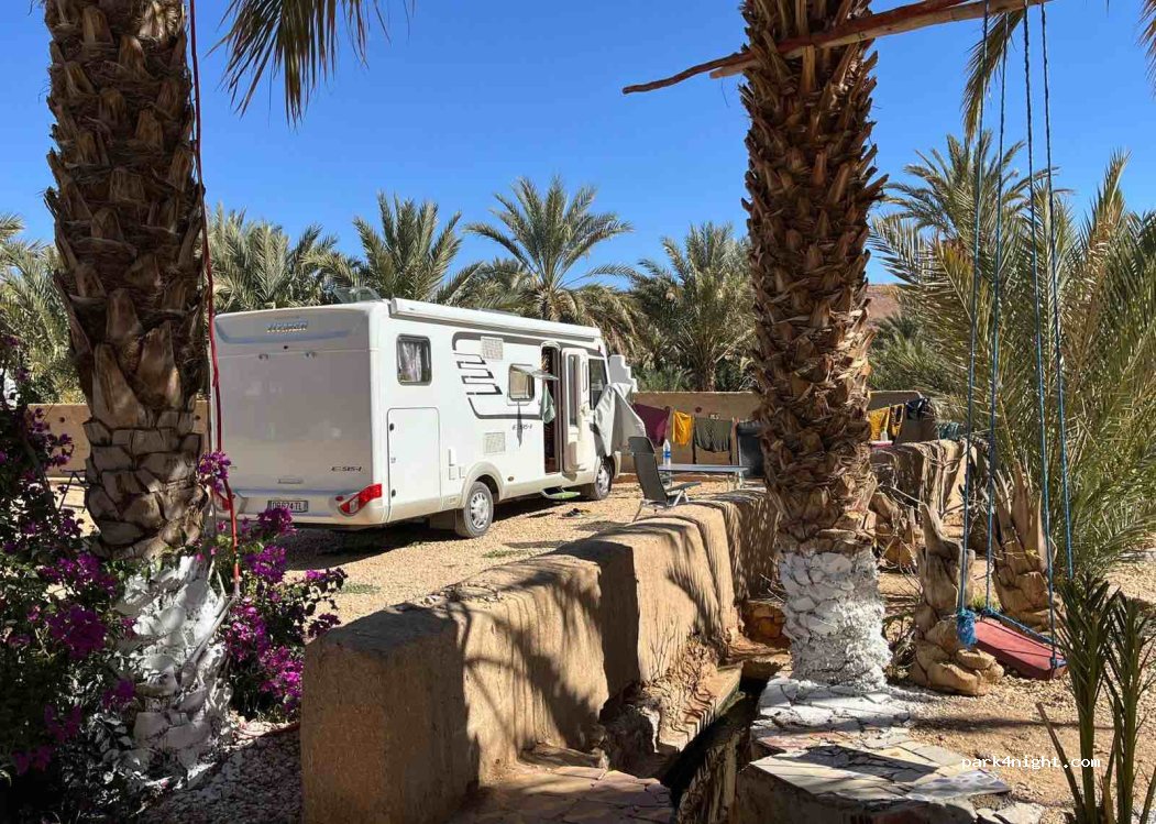A familiar campsite, friendly owner who welcomed us with tea and peanuts, he assigned us a large pitch where we stayed two nights; the road was a little bit noisy until 10 P.M. but after it was quiet and safe. Services were a little bit old but clean. The owner also gave hot bread in the mornings for 5 Moroccan dirhams each one! The campsite has direct access to the palm grove.
