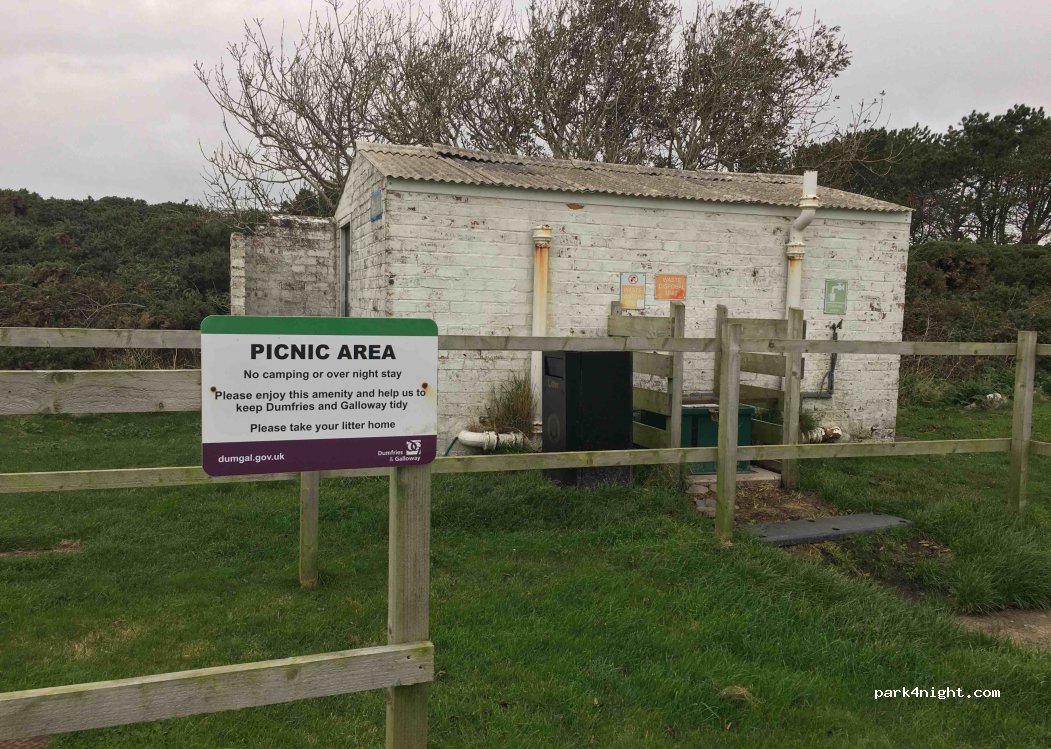 Fabulous little parking area, it's right next to the beach and has public toilets stocked with loo roll and paper towels - they are always open. Dumfries & Galloway council own the land and maintain it. Please keep it tidy if you go as it would be a shame if they closed it.