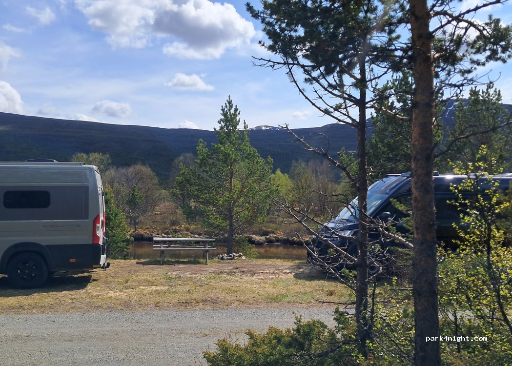 Perfect if you like the wild style of camping but without the worry of being moved on. Loads of picnic benches, fire pits and even a sheltered seating area for those who want to get out of the motor home but avoid the weather. Can pay cash for 75NOK or 95NOK on the website. Stunning views right next to the river and plenty of walks directly from the camp.