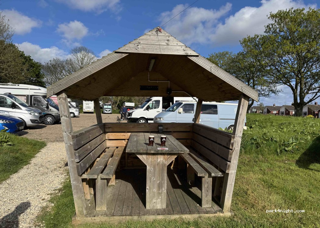 Arrived here at 5:30pm, parked on the grass next to two motorhomes. Went in for a drink and asked how much to stay over and was told it was free if you had a drink. Loads of outdoor seating and covered pods which was great as the weather was very wet.