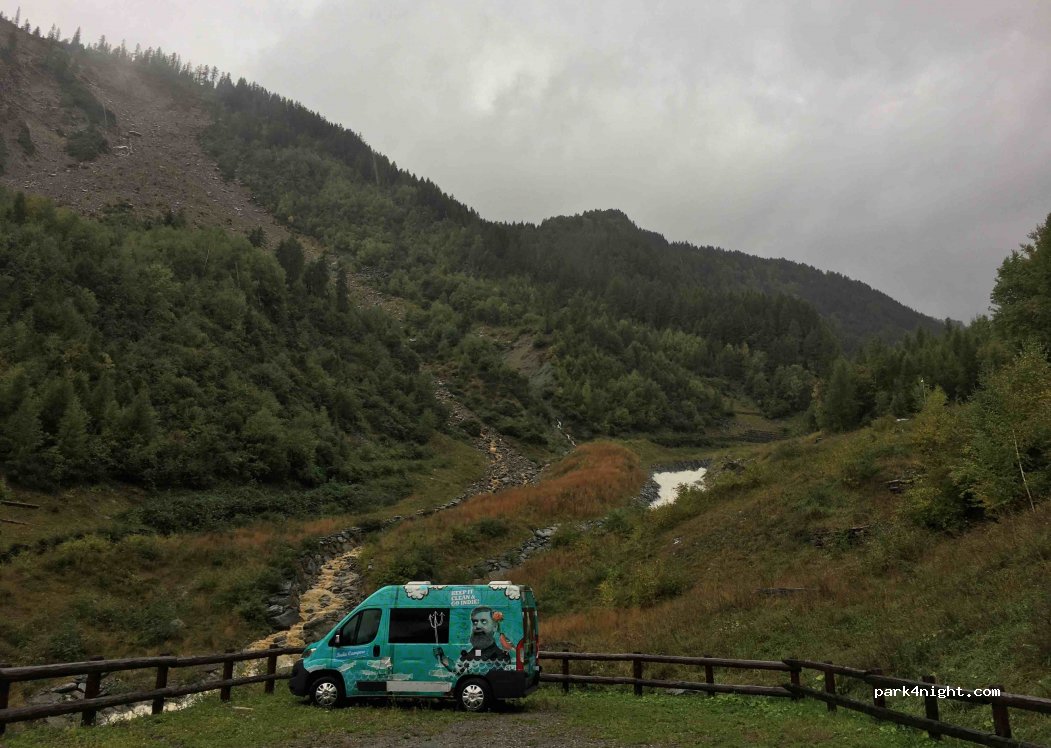 Beginning of the torrent Torregio, the road narrows and it seems that it does not go anywhere, but a few meters away you are in a perfectly suitable parking lot with a playground, a water fountain and 4G, next to the torrent . The river drops sharply in October, not sure if the area during the thaw season could be dangerous. The area is under video surveillance and there is an emergency telephone number. Very close to town.