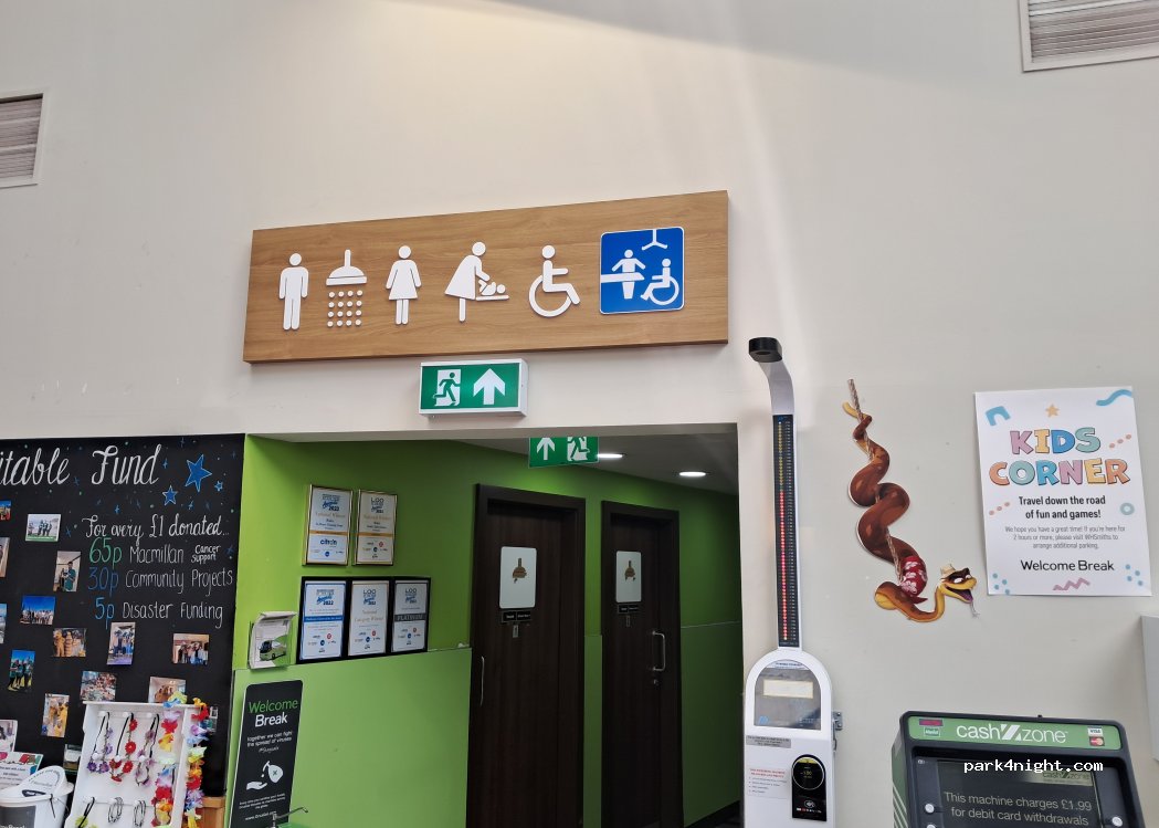 As previously described. Very helpful lady in WHS got me to login into parking app as broken down and stayed overnight for free. Toilets and showers free, clean and lots hot water. Good place to stop for overnight stay when arriving late.