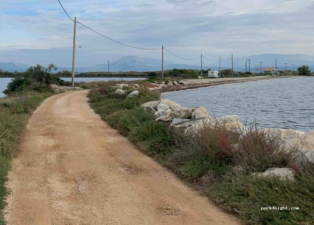 Sehr ruhig, die meisten Camper bleiben auf dem ersten Platz vorne im Dorf. Kleine Strässchen führen zu den anderen Inselchen und aufs Festland, mit dem Roller gut zu fahren. In der Nähe eine grosse Flamingo-Kolonie. Achtung: keine Geschäfte im Ort, vormittags um 10 kommt ein ambulanter Bäcker, Supermarkt erst in Arta. Auf dem Weg direkt vor uns eine Horn(?)viper gesehen.