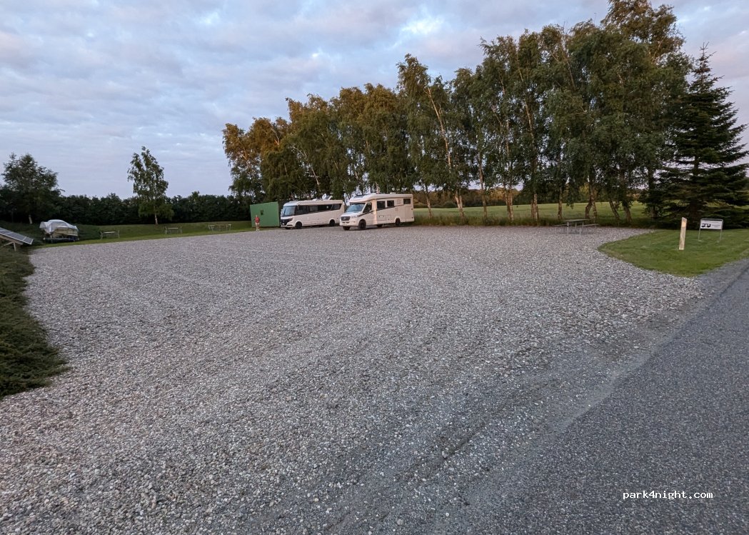 Parfait pour une nuit. 10 euros la nuit (eau et électricité compris). Moins chères que les aires au Danemark. 10 euros ou 75DKK à mettre dans une enveloppe et dans la boîte aux lettres à votre arrivée. Grand terrain je recommande vivement. Les propriétaires vivent à côté.