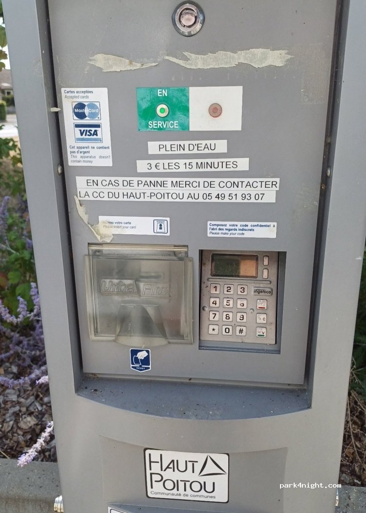 La borne fonctionne parfaitement. 3€ payable par carte pour avoir de l’eau. Un raccord mâle/mâle est nécessaire. Suivre les instructions affichée. La propreté des lieux dépends des utilisateurs...