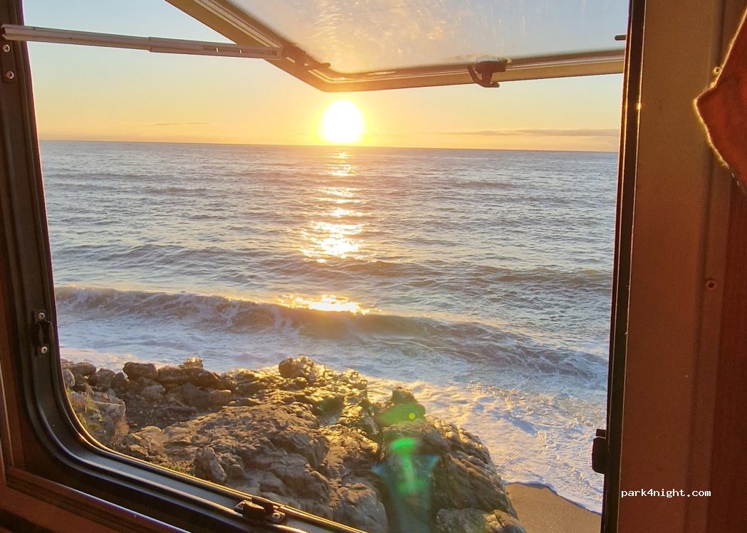 Super emplacement pour passer la nuit, directement au bord de l’eau on se croirait dans un bateau ! Bruit de la route quasi inexistant la nuit et bruit des vagues vraiment agréable. Des poubelles à proximité et une petite plage en contrebas assez propre.