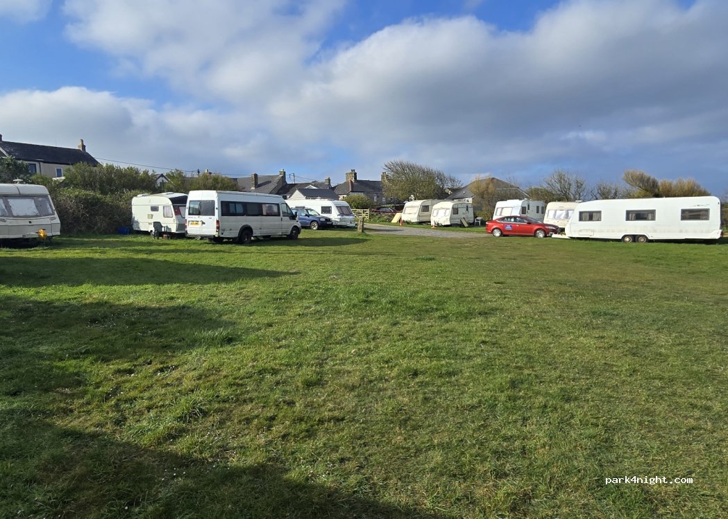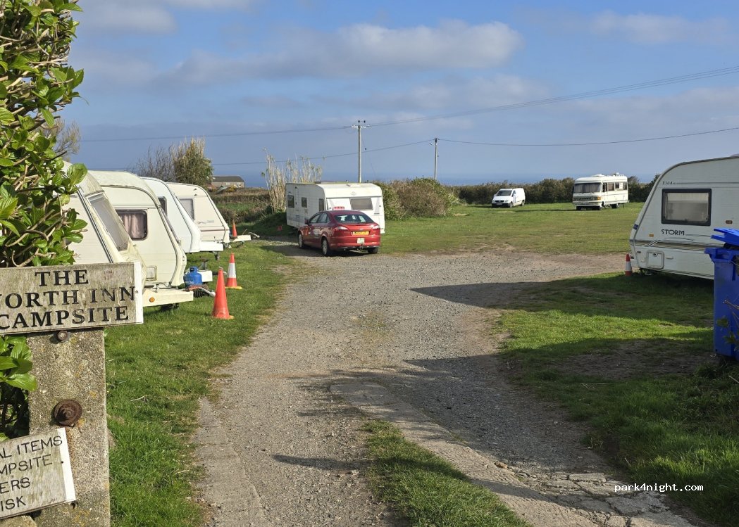 Friendly, traditional pub (The North Inn) with good food in the field at the back. Motorhomes, caravans, tents. Excellent pub food, almost more dogs than people in the pub, breakfast served, great walks from the campsite.