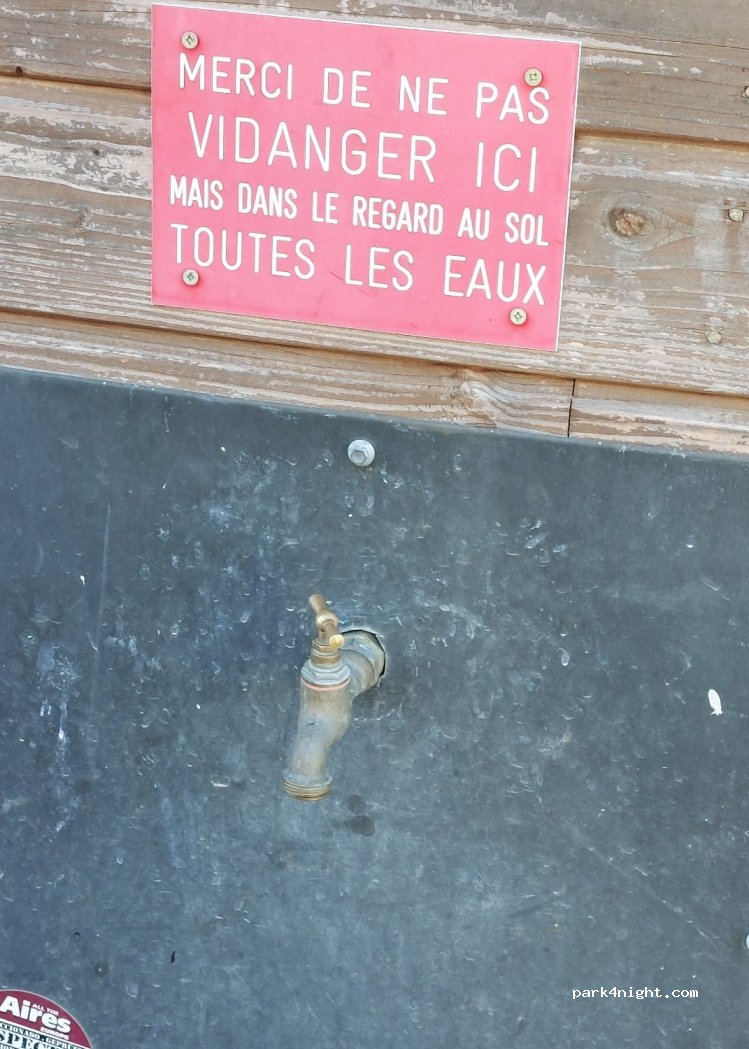 Pas d’eau robinet, hors service pour risque de gel en cette saison. Effectivement il gèle. Stationnement à plat et très calme.