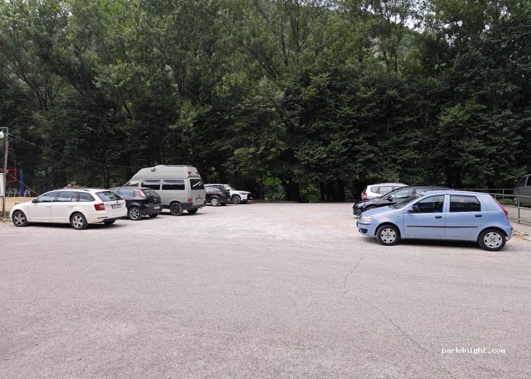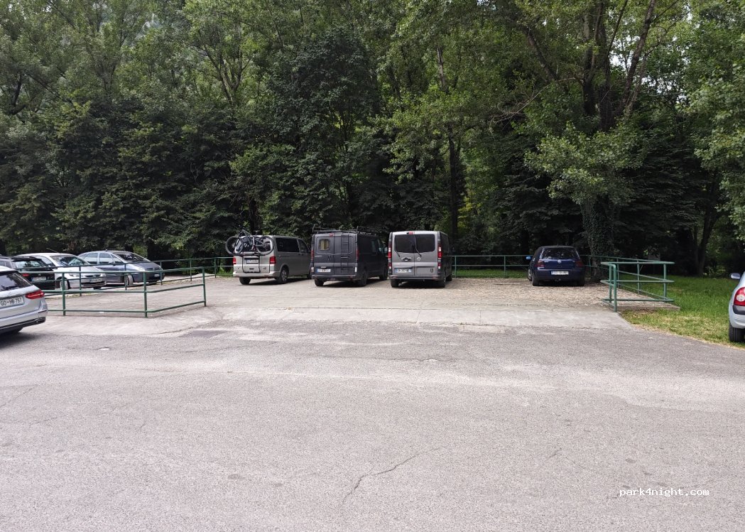 Parking calme, proche du restaurant. Beaucoup d’activité possible (basket, beach volley, tennis..) Des bancs à proximité de la rivière pour pouvoir se poser sans sortir table et chaise. Du monde jusque tard le soir mais la nuit est très calme. Lever à 8h en étant les seuls ici!