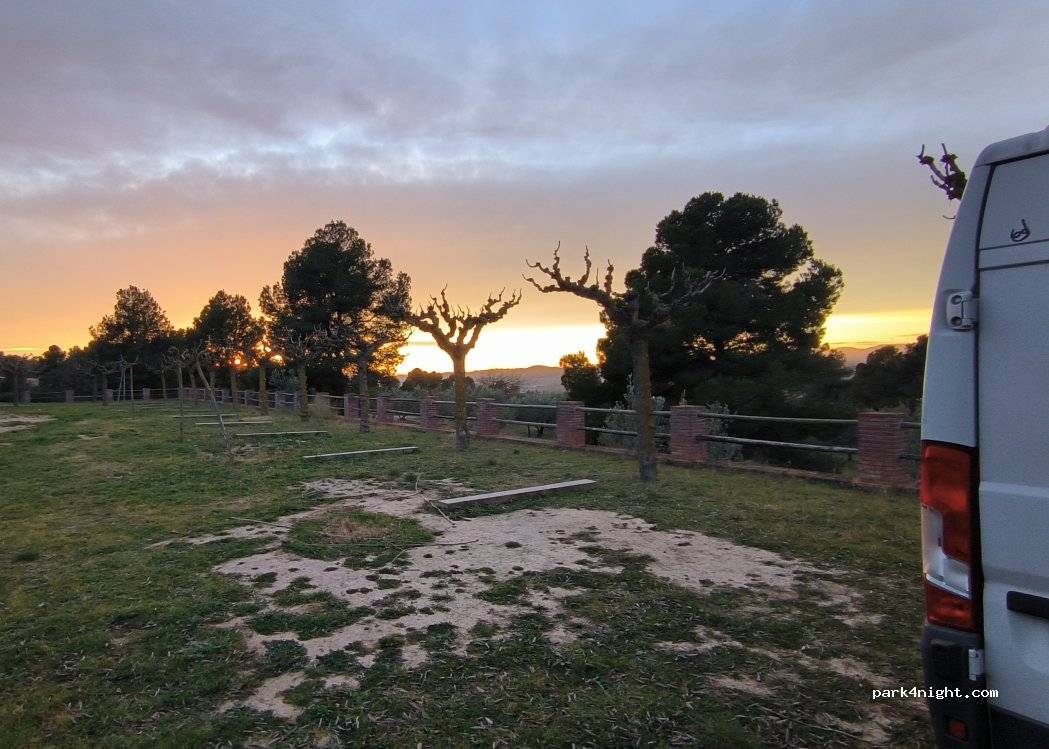 Aparcamiento tranquilo con vistas a Sarral. Unas 10 mesas de picnic bajo los árboles. Barbacoa disponible. Contenedores de basura. (Cerrado durante mi visita, llave de agua y restaurante a 100m.) Juegos para niños. Acceso a CC, furgonetas y Caravanas.