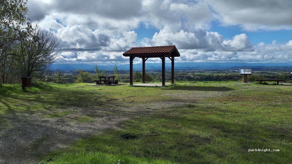 Panorama exceptionnel sur la chaîne des Pyrénées. Parfait pour faire une pause ou le pic nic. Mais pas pour y dormir car malgré le grand espace dispo, grosses pierres devant l'entrée empêchant de stationner sur l'herbe. Donc on se gare vraiment sur le bord de la route (acotement) un peu passante de jour. 2 places pour voitures/vans ou 1 place pour camping car.