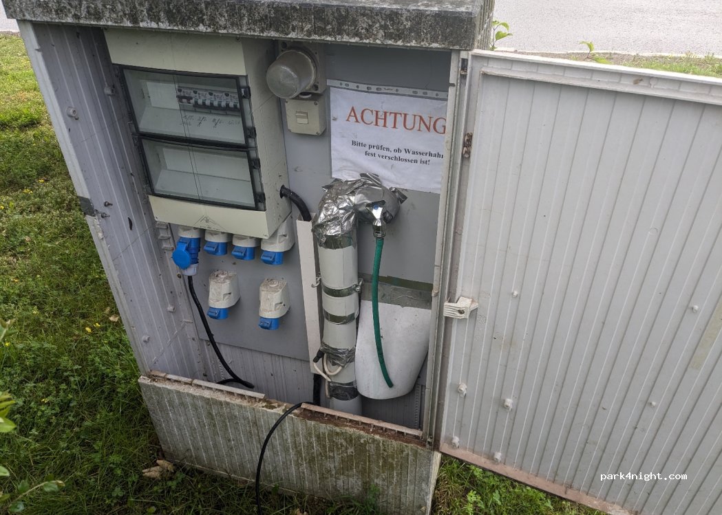 Ruhiger Platz nachts, am Tag fahren gerade Baumaschinen herum, weil der Park nebenan neu gestaltet wird. Wasser und Strom im grauen Kasten. Schlüssen im Tourismus Büro erhältlich.