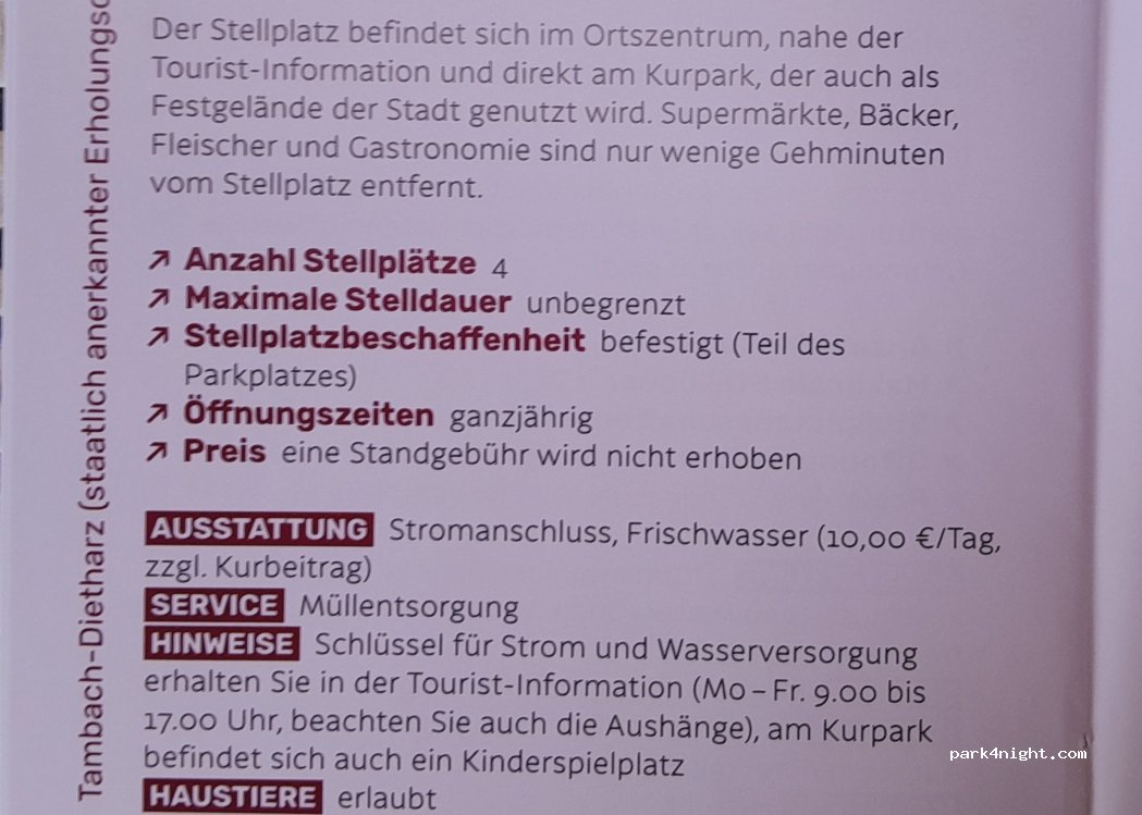Großer Parkplatz direkt an einem kleinen Kurpark. 4 ausgewiese Womo-Plätze. Schlüssel für Strom über die 150m entfernte Touristinfo oder Platzwart per Telefon anrufen. Wer keinen Strom benötigt kann sich im hinteren Bereich des Parkplates ein Plätzchen suchen, dort ist es zu Schulzeiten ruhiger vor dem ab 7Uhr beginnenden Kinderschulbringverkehr.
