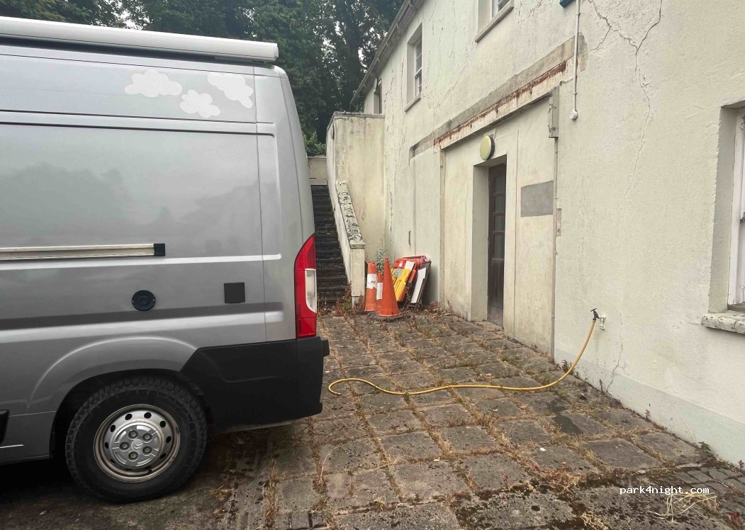 Great place to park, easily accessible lots of parking and other vans/motorhomes there on arrival. We cycled into town and the ranger was really helpful! There is a public water tap behind some iron gates, 5 minute walk away from the car park!