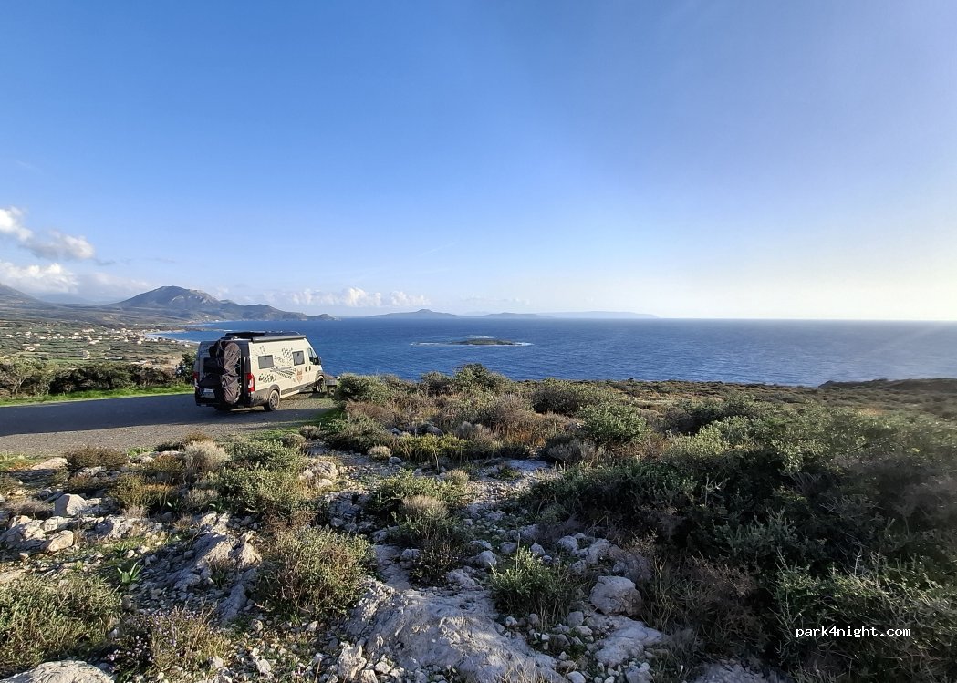 Schöner Platz! Wir standen zwei Nächte und haben keine anderen Menschen oder Autos gesehen, sehr ruhig. Internet sehr gut (Cosmote). Es gibt eine gute Picknickbank mit Picknicktisch. Gerader Platz, auch für ca. 3 Fahrzeuge.