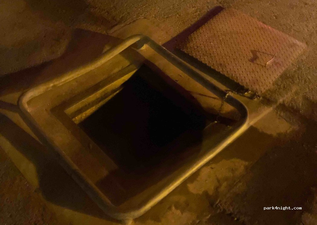 Alcantarilla para aguas negras y grises dentro de un aparcamiento. Está bastante bien.