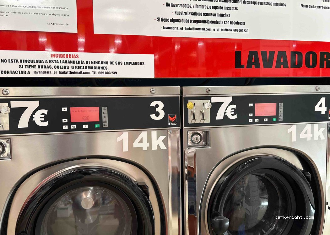 Neue Maschinen. Sehr sauber. Perfekt. Es gibt 2 Waschmaschinen a 14 kg und 2 Trockner. Der Waschsalon befindet sich im Carrefour Gebäude. Es gibt einen grossen Tisch zum Wäsche zusammenlegen. Man kann mit dem Wohnmobil super parken auf der oberen Ebene neben den überdachten Parkplätzen
