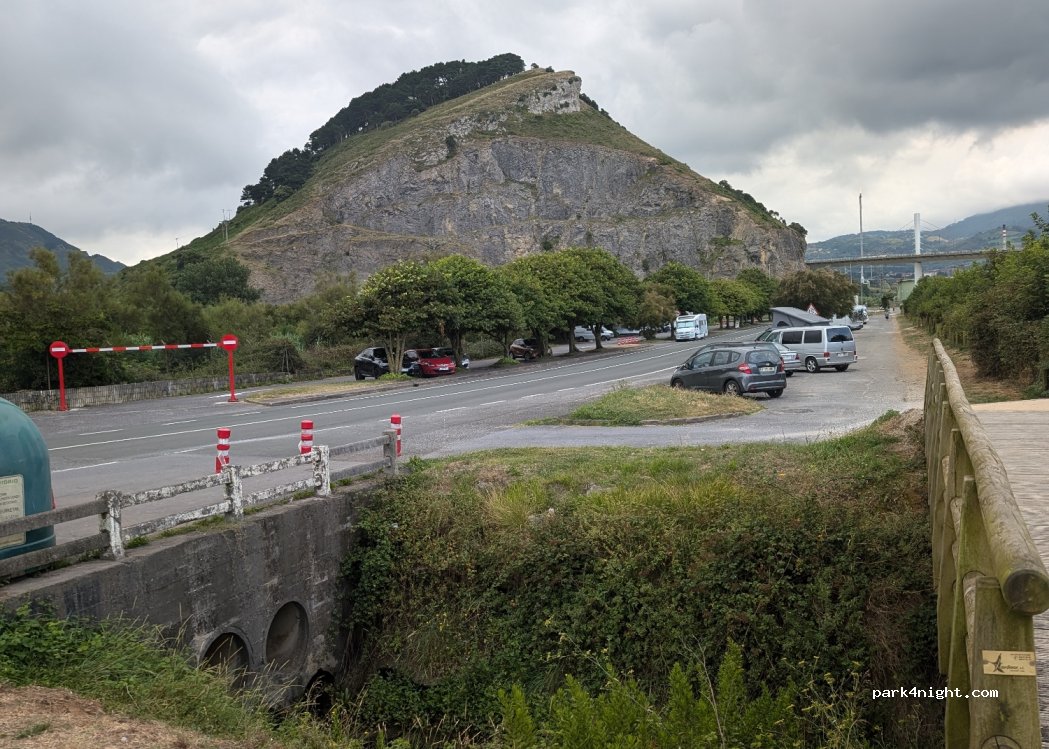 we had a very quite night here very little traffic or noise. it does not look like a good place as its within view of the large oil refinery and motorway suspension bridge, but it was fine. there are rubbish bins by the beach and showers there. very convenient for the ferry home from Bilbao.