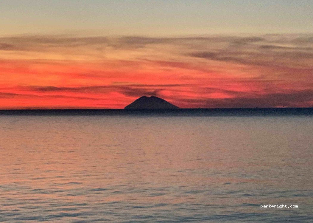 Parcheggio bordo strada a fianco della spiaggia libera. A pagamento dalle 8 alle 20 2€/ora e gratuito di notte. La notte molto tranquillo, c’erano altri piccoli camper parcheggiati. Tramonto con vista Stromboli incredibile