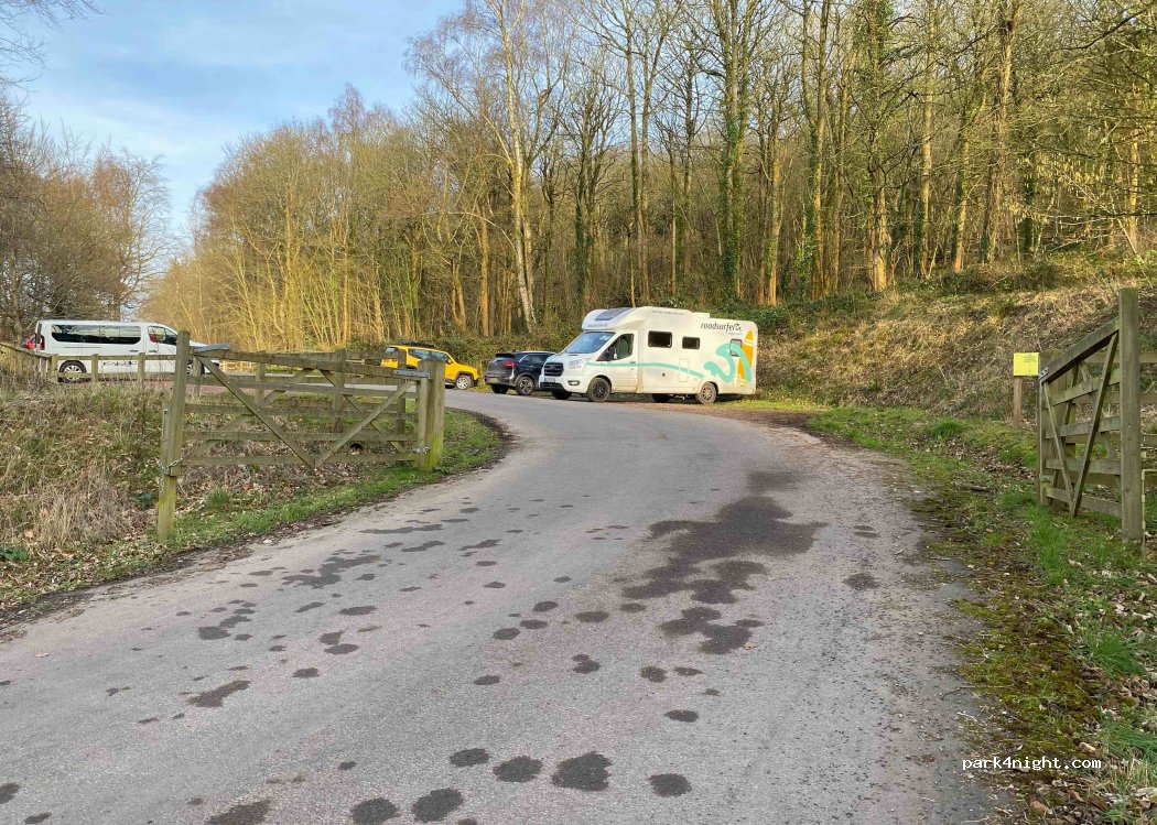 Beautiful spot, car park for woodland walk. The car park is on a slope but manageable. Very quiet although lots of dog walkers in day light hours, at night you'll probably have the car park to yourself. Definitely recommend as a stop over!