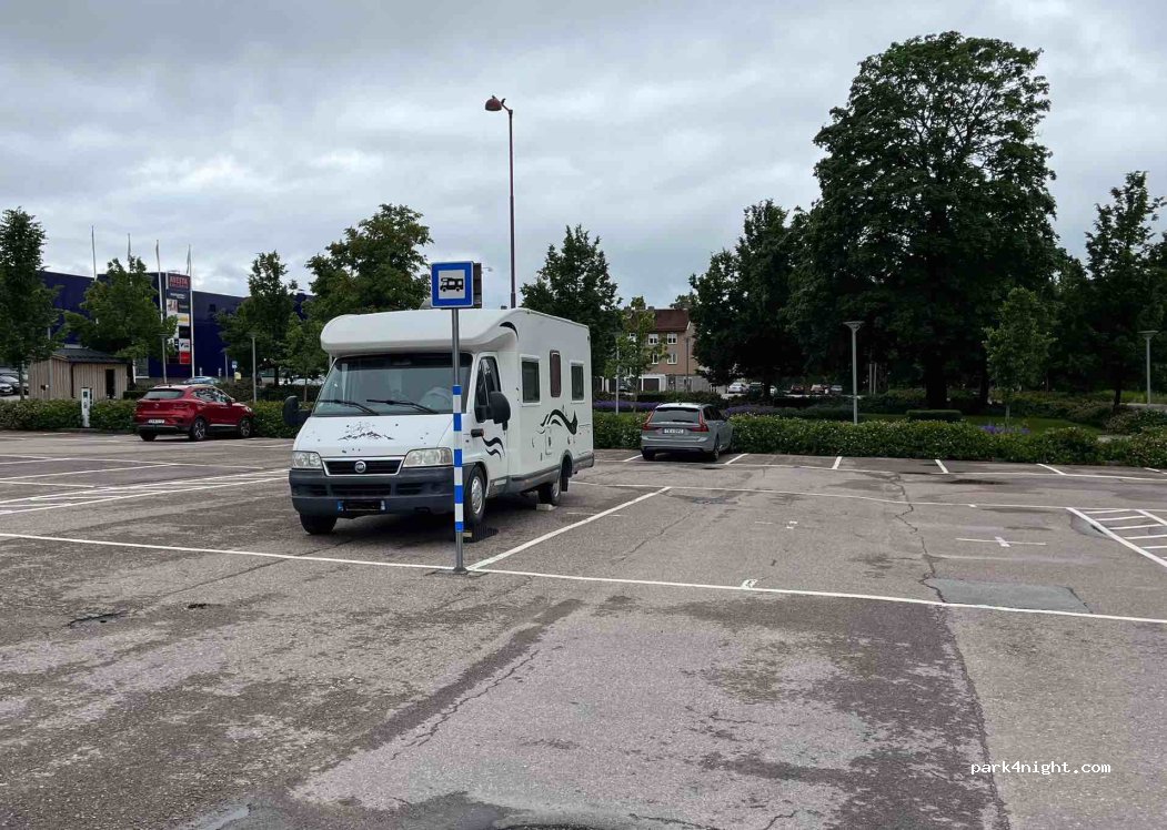 Two large free camper spots in a perfect location for visiting the city or shopping. View of the Avesta Galleria shopping center and the city is full of shops, restaurants and coffee shops. There is no electricity and only rubbish bins. The surface is asphalt but bumpy.